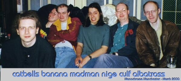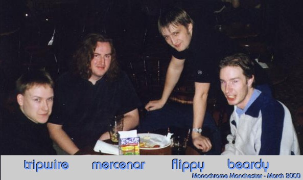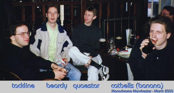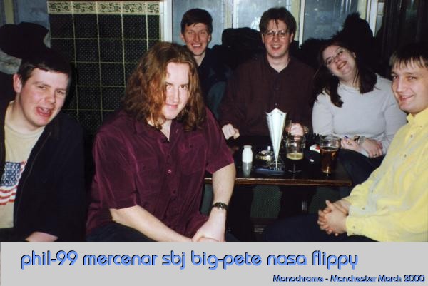 Manchester Meet - March 3-5 2000Author(s): Caroline Lamb(mirath) (with much help from Madbob) Organising a meet is, I imagine, somewhat like giving birth. You have one, and you think "never again!". But a year or two later you've forgotten the pain and the screaming and you think "That wasn't so bad. Let's have another!". ![]() So madbob and I got our arms twisted into organising a Manchester meet. This was the second meet I've organised, and luckily we were blessed with a bit more accomodation this time. The Travelodge did some good business, even so, thanks to the Ben(quaestor) & Bob(madbob) contingent. For Bob and I the meet began sometime during the week - we certainly seem to have spent most nights in a pub somewhere, at any rate. Thursday we had a great curry with the rest of the Manchester-based spods (David - sbj, John - albatros, Terry - mwxutbi, Andy - random, Phil - Phil-99, Andrew - tripwire). Then we went to 5th Avenue, a dive of a club most of us own up to having attended at least once when we were students, and didn't know any better. Lou (nasa) and Pete (big-pete) had arrived early, so they came too and became honorary mancspods. ![]() On Friday, Lou and I did girly things for most of the day. Andrew and Pete spent the morning playing Quake. Bob flitted back and forth across the country stressing about spods, accommodation, jobs, and broken mobiles. Phil acted completely unlike a student; he went to Friday morning lectures. Midafternoon we collected Kevin (vampyre) from the station and took him shopping for sparkly things at the student's favourite haunt, Affleck's Palace - a multi-floor emporium of all things shiny and tacky. We were expecting to collect Tristan (mercenar) a little later, but together with Mark and Dave (Flippy and Beardy), he was delayed on the motorway by a car fire. They still managed to get to the pub before we did, though. Over the years, the Wetherspoons on Picadilly has eventually become the default location for Mancmeets - although Barney's and the Goose are putting up stiff competition. Bob continues to agitate for more visits to Yang Sing.